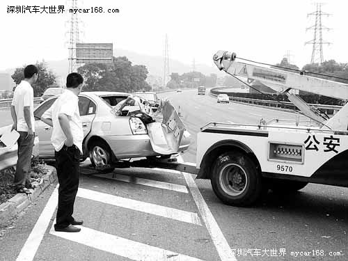 27日上午11点多,在机荷高速梅观路口,一小车司机因为不认识路,迟疑中减速看路牌时,在快车道上被相继而来的两台大货柜车刹车不及追尾,小车被撞飞到路中的隔离栏上,车子受损严重,小车司机受伤。